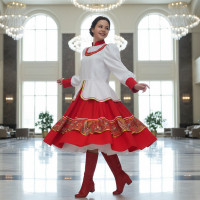 Костюм выполнен из габардина и красиво подобранного декора в золотистых цветах. Достоинства габардина в том, что он не мнется, не блестит, как атлас, ложится красивыми мягкими складками, цвет не выгорает. Юбка с оборкой, декор в золотистых цветах, по талии на двойной резинке. Блуза белого праздничного цвета, с баской, рукава расширены внизу, с манжетами. Сзади на блузе шнуровка. Она дает хорошую посадку по фигуре. Костюм предназначен для творческих сольных и коллективных театральных выступлений.