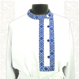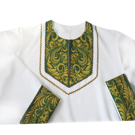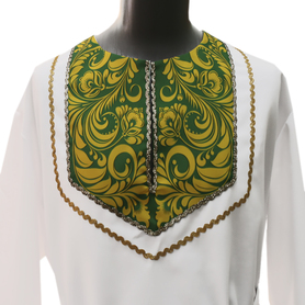 Косоворотка изготовлена из двух цветов. Низ рубахи и рукавов декорирован белой тканью. Ворот и планка на груди украшены жаккардовой тесьмой. Рубаха смотрится яркой, праздничной и оригинальной.