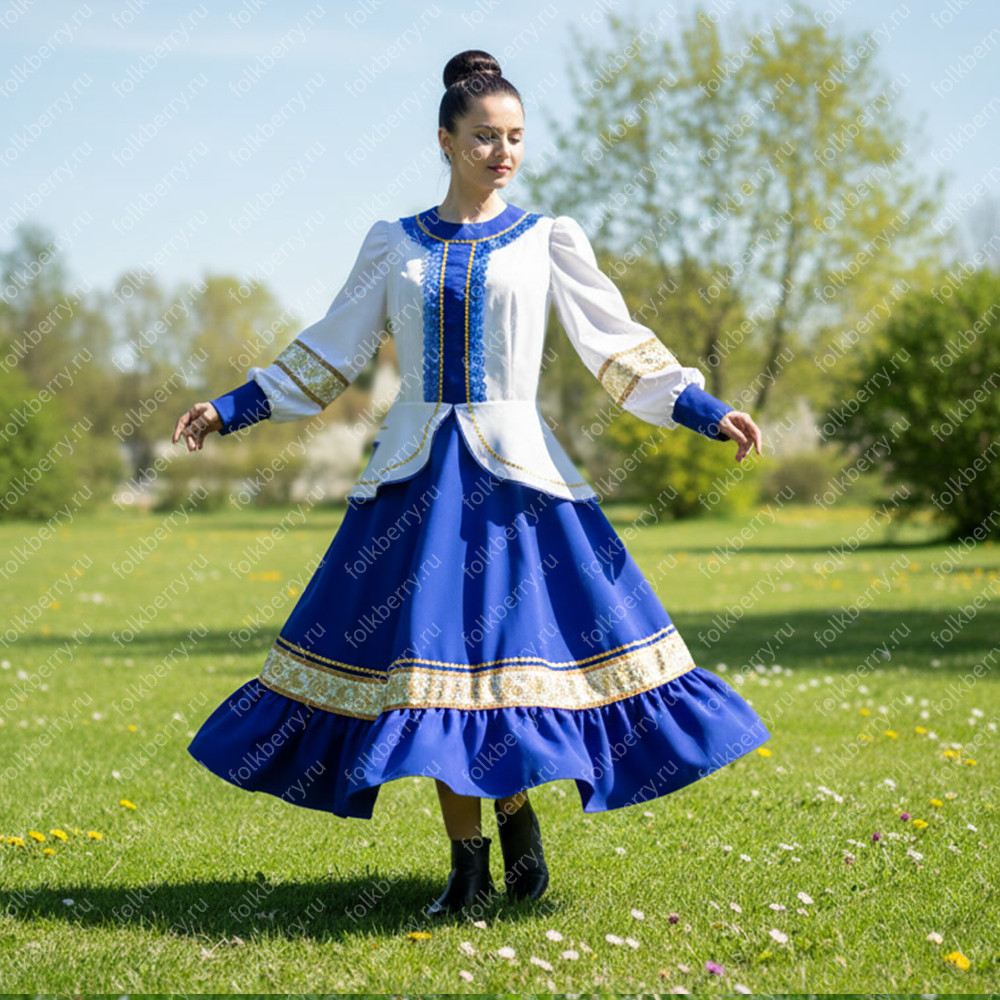 Костюм выполнен из габардина и красиво подобранного декора в золотистых цветах. Достоинства габардина в том, что он не мнется, не блестит, как атлас, ложится красивыми мягкими складками, цвет не выгорает. Юбка с оборкой, декор в золотистых цветах, по талии на двойной резинке. Блуза белого праздничного цвета, с баской, рукава расширены внизу, с манжетами. Сзади на блузе шнуровка. Она дает хорошую посадку по фигуре. Костюм предназначен для творческих сольных и коллективных театральных выступлений.