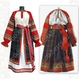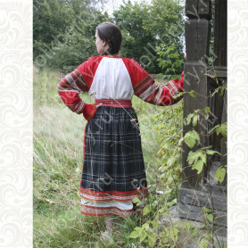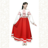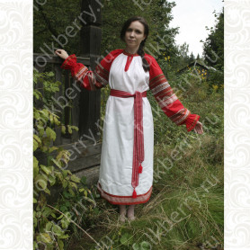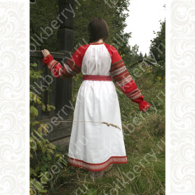 Декор платья - жаккардовая тесьма со славянскими символами. Талия немного завышена, пояс в комплекте.