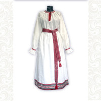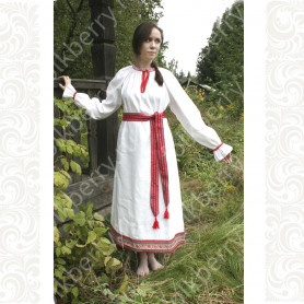 Декор платья - жаккардовая тесьма со славянскими символами. Талия немного завышена, пояс в комплекте.