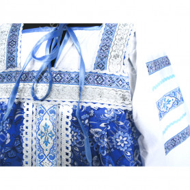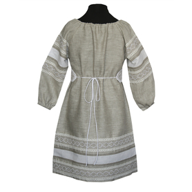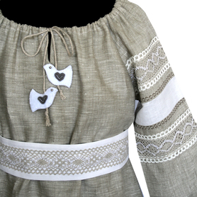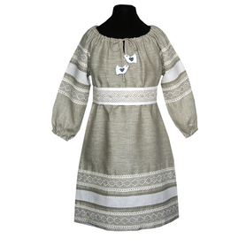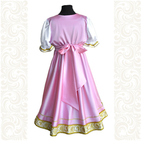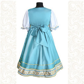Платье «Дмитра» отрезное по талии, рукав реглан, юбка - почти солнце, длиной немного ниже колена. С поясом. Важно отметить, что декор платья выдержан в славянском стиле, но в целом, платье «Дмитра» - современное прочтение народных традиций. Как правило, дети и подростки с удовольствием выбирают его. Романтичное, удобное и нарядное, оно дарит ощущение радости и праздника. Замечательно подходит для тематических праздников в детских  учебных заведениях, по фасону и яркости цветов отлично подойдет для танцевальных коллективов. Платье выполнено из немнущейся, матовой ткани "габардин" символичных для славян цветов ( красного, синего, зеленого, бордового).