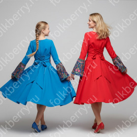 Платье «Дмитра» - современное прочтение славянских традиций. Платье четкого силуэта, чуть ниже колена, чистого яркого цвета. Платье отрезное по талии, длинный рукав-реглан, регулируемая горловина, юбка "почти солнце", с поясом. Для платья подобран эффектный декор - солярные славянские знаки. Платье сшито из габардина, ткани, которая не блестит и не мнется, всегда выглядит аккуратно, ярко, празднично, романтично.