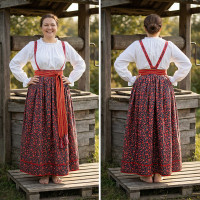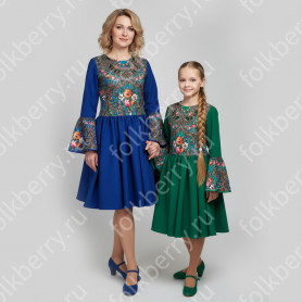 Фасон: Юбка – почти солнце, длиной чуть ниже колена, завышенная талия, рукав реглан, регулируемая горловина, пояс в комплекте.