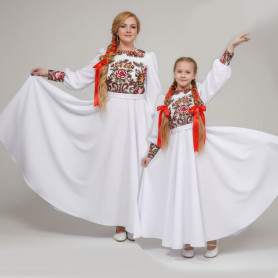 Платье сшито из яркого красного атласа и декорировано вставками с рисунком «хохлома». Юбка фасон полтора «солнца», подол и горловина украшены белым кружевом и тесьмой. Рукава «фонарики» сделаны из легкой, белой органзы.