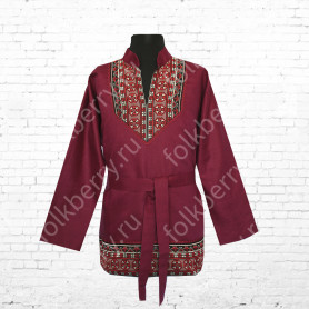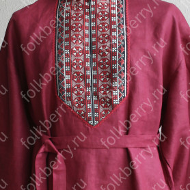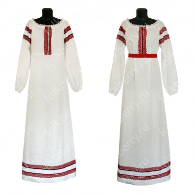 На рукавах и подоле между красным кружевом вставки из шитья. Горловина регулируется по ширине, т. к. собрана на резинку Платье слегка расклешено к низу. В комплект входит длинный пояс украшенный кружевом. Платье хорошо сочетается с юбкой поневой из ажурного шитья Белая птица. В пару к этому платью подходит мужская косоворотка из белого льна Православная, Оберег, рубаха мужская Истоки
