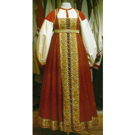Платье изготовлено из умягченного льна белого цвета,  украшено красным и белым кружевом, а также бархоткой,  изящной тонкой блестящей тесьмой.
