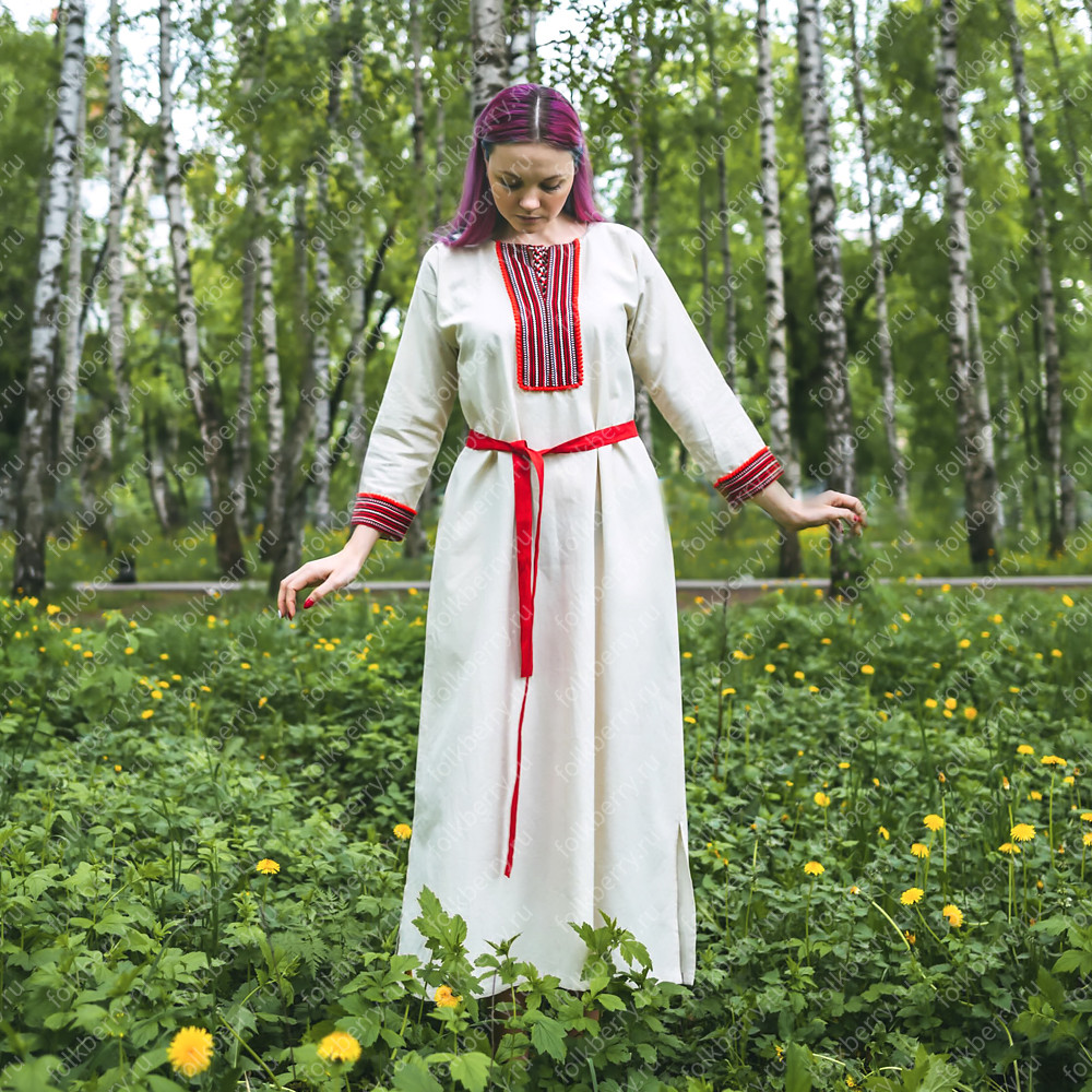 Рубаха женская "Славянская" удобная, красивая одежда, которая прошла проверку временем, потому что носили их женщины и девушки с незапамятных времен. Длинную рубаху надевали с сарафаном, с юбкой-поневой, с фартуком или носили отдельно как самостоятельный наряд. Рубаха с поликами, длинная, по бокам разрезы 30-40 см, выполнена из небеленого или белого льна, украшена декоративной тканной лентой шириной 5 см, с поясом в цвет декора. Для усиления образа, можно с рубахой надевать славянский традиционный тканный пояс и очелье ( повязка на голову)