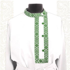 Мужская рубаха «Истоки» выполнена в свободном крое, подходящим любой фигуре. Сшита из льняной ткани. Модель имеет втачной, короткий рукав, ворот с завязками, с  поясом (кушаком) из ткани с тесьмой. По низу, вороту, рукавам изделия  декор из жаккардовой тесьмы со славянским рисунком- оберегом.