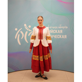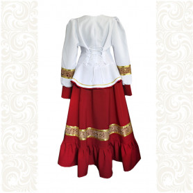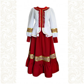 Выполненный в православном стиле сарафан с блузой «Русь» сшит из натурального хлопка в цветочек. Модель скромно декорирована однотонным воланом в цвет с основной тканью и тесьмой вьюнок. Можно носить под пояс и регулировать бретели по длине. Белая блузка из хлопка с длинным рукавом расшита натуральным нежным кружевом.