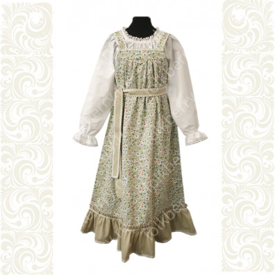 Выполненный в православном стиле сарафан с блузой «Дуняша», сшит из натурального хлопка в мелкий цветочек. Модель скромно декорирована однотонным воланом в цвет с основной тканью и тесьмой вьюнок. Можно носить с поясом и регулировать бретели по длине. Белая блузка из мягкого хлопка с длинным рукавом реглан украшена по горловине и рукавам натуральным нежным белым кружевом. В комплект к сарафану с блузой можно подобрать головной убор. Сарафан подходит для учениц православных школ и детских садов, для посещения церкви, православных праздников.