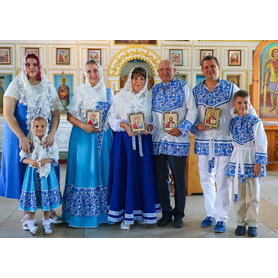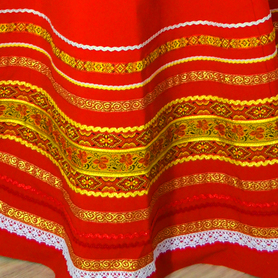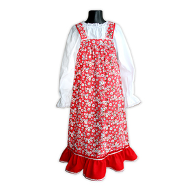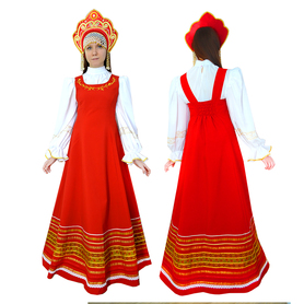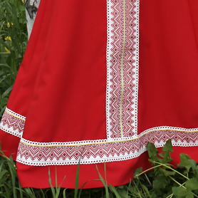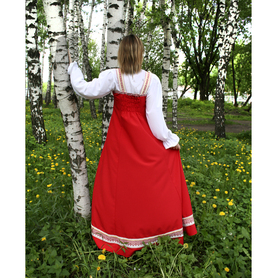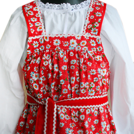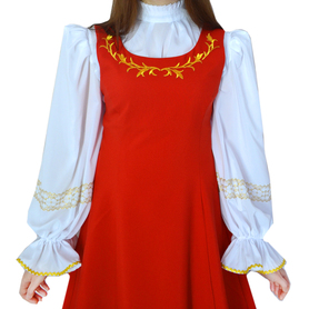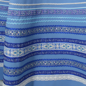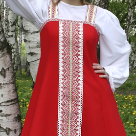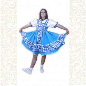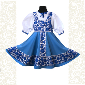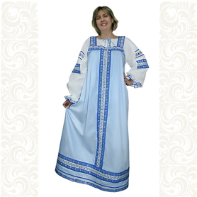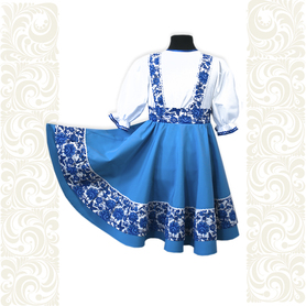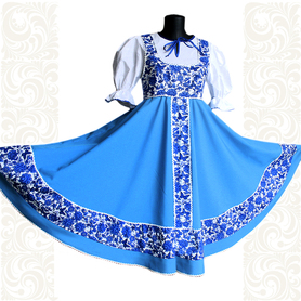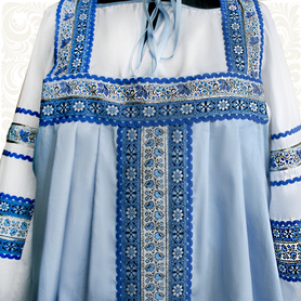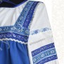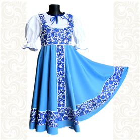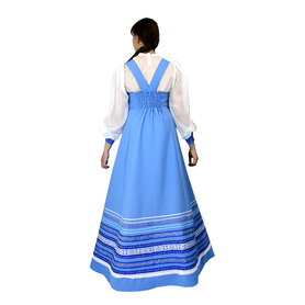 Комплект «Голубые узоры» идеально подходит для участия в традиционных славянских праздниках и мероприятиях. Длинный сарафан выполнен в русском народном стиле. Изготовлен из хлопковой ткани голубого цвета. Смотрится очень нежно и женственно. Сарафан декорирован сине-голубой жаккардовой тесьмой. Бретели регулируются по длине.