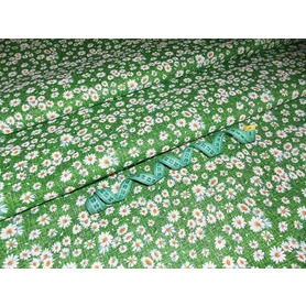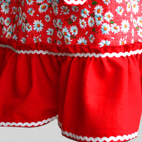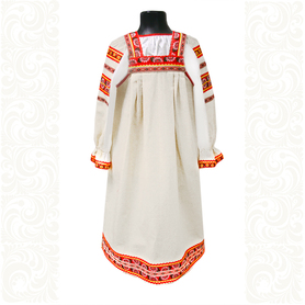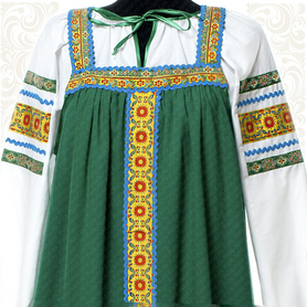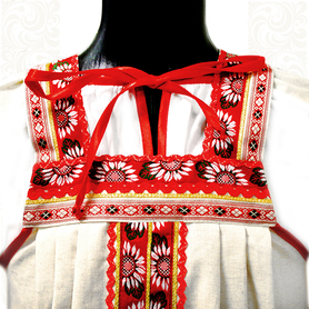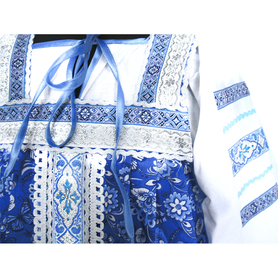 Блуза сшита из хлопка, по рукавам красиво декорирована жаккардовой тесьмой. Горловина регулируется по глубине при помощи завязок.