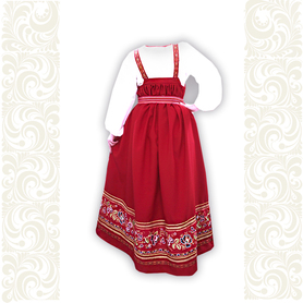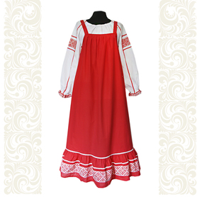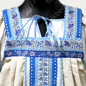 Сарафан декорирован широкой полосой  жаккардовой тесьмы, блестящего шнура, вьюнка, кружева, что придает изделию дополнительные красоту и торжественность.