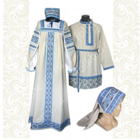 Сарафан с блузой Красна девица в голубом цвете – очень женственная модель русского сарафана. Вверху сарафан идеально облегает грудь, мягко облегает  талию, плавно расклешается до 3 метров в диаметре внизу.