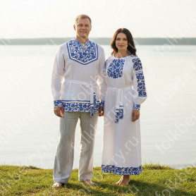 Сарафан состоит из кокетки спереди и сзади; бретелей, которые можно регулировать по длине; юбки-солнце средней длины с пышной оборкой. Сарафан выполнен из ткани габардин и украшен жаккардовой тесьмой, вьюнчиком.