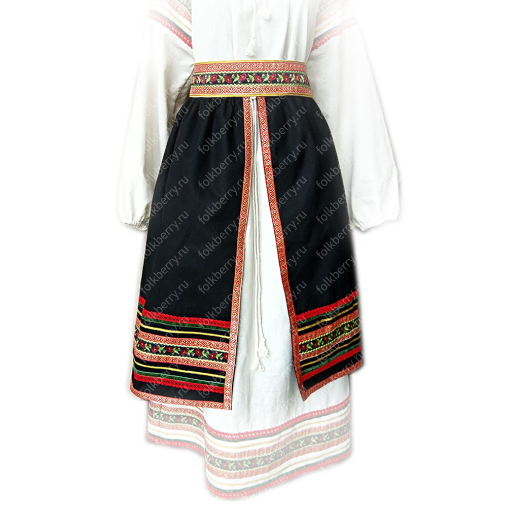 Юбка-понева состоит из трех прямоугольников, собранных на общем поясе или шнуре. Юбка красиво украшена декоративной тесьмой, тщательно подобранной дизайнером (с рисунком Маки, вьюнками разного цвета, бархатной тесьмой)